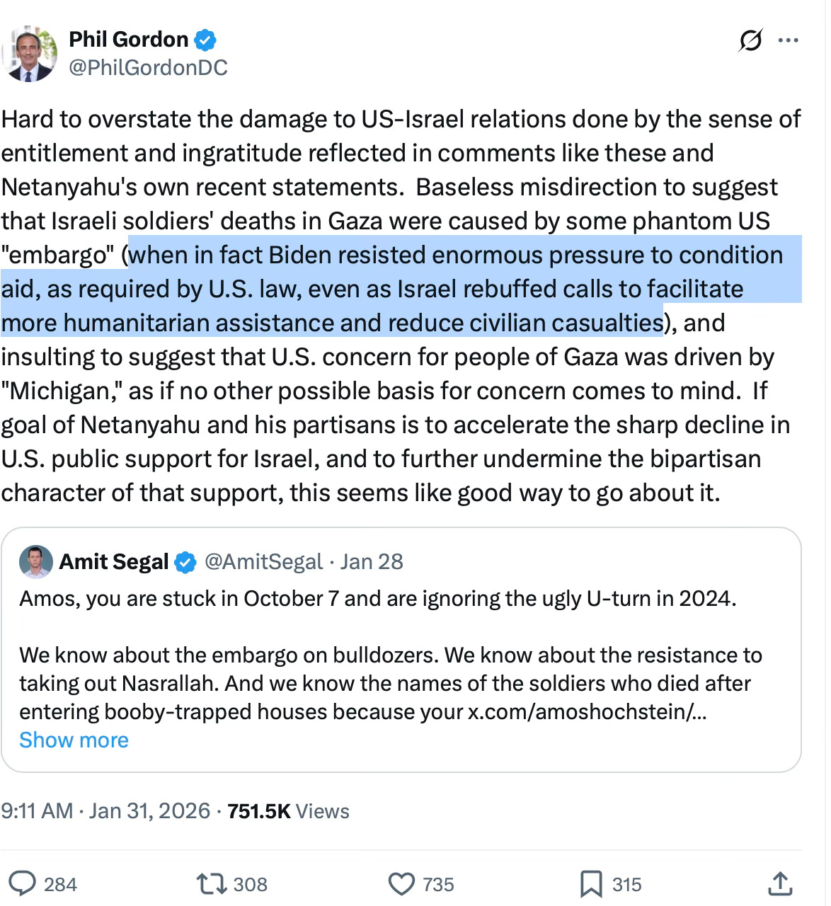 In response, Gordon said, “Hard to overstate the damage to US-Israel relations done by the sense of entitlement and ingratitude reflected in comments like these and Netanyahu’s own recent statements. Baseless misdirection to suggest that Israeli soldiers’ deaths in Gaza were caused by some phantom US ‘embargo’ (when in fact Biden resisted enormous pressure to condition aid, as required by U.S. law, even as Israel rebuffed calls to facilitate more humanitarian assistance and reduce civilian casualties)”.