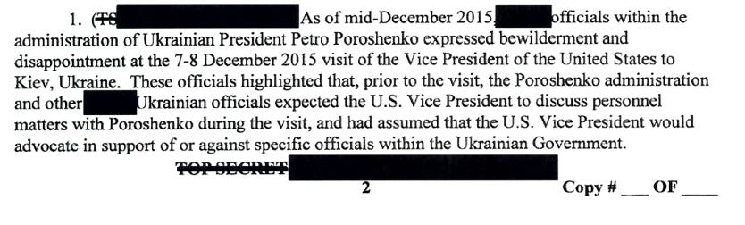 The section states that, “These officials highlighted that, prior to the visit (from Joe Biden), the Poroshenko administration and other Ukrainian officials expected the U.S. Vice President to discuss personal matters with Poroshenko during the visit, and had assumed that the U.S. Vice President would advocate in support or against specific officials within the Ukrainian government”.