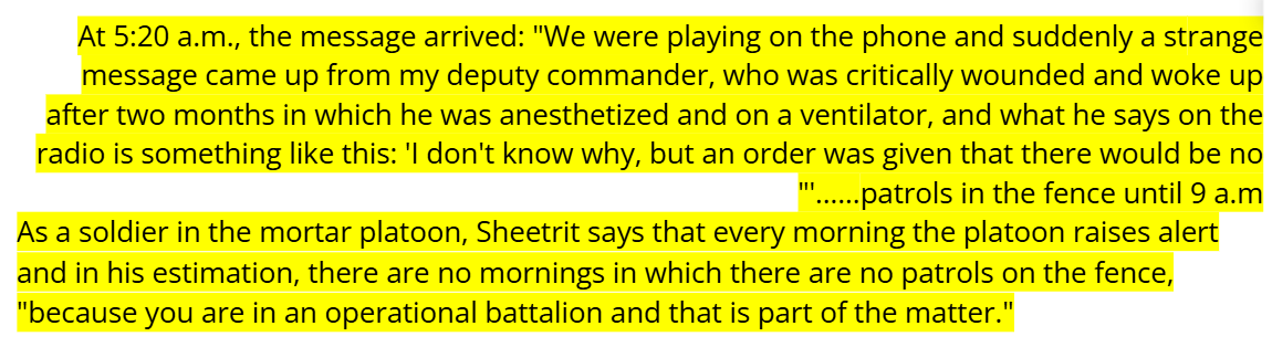 Above: Shitrit testifying that the order was given that there would be “no patrols in the fence until 9 a.m.” on October 7th despite the fact that “there are no mornings in which there are no patrols on the fence”.