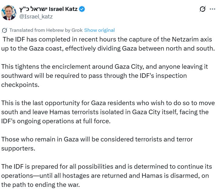 While Netanyahu pretends to negotiate an end to the genocide in Gaza, Israel’s defense minister, Israel Katz, says that the IDF will slaughter the entire population of Gaza City that does not move to the South.
