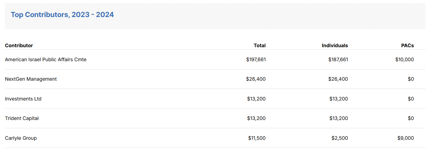 Jewish Insider also reported that he has “pushed legislation to provide Israel with so-called bunker buster bombs”, “pushed to have provisions added to the supplemental aid bill for Israel that would require all aid to be delivered rapidly to Israel,” and “has been an active supporter of anti-Boycott Divestment and Sanctions legislation”.