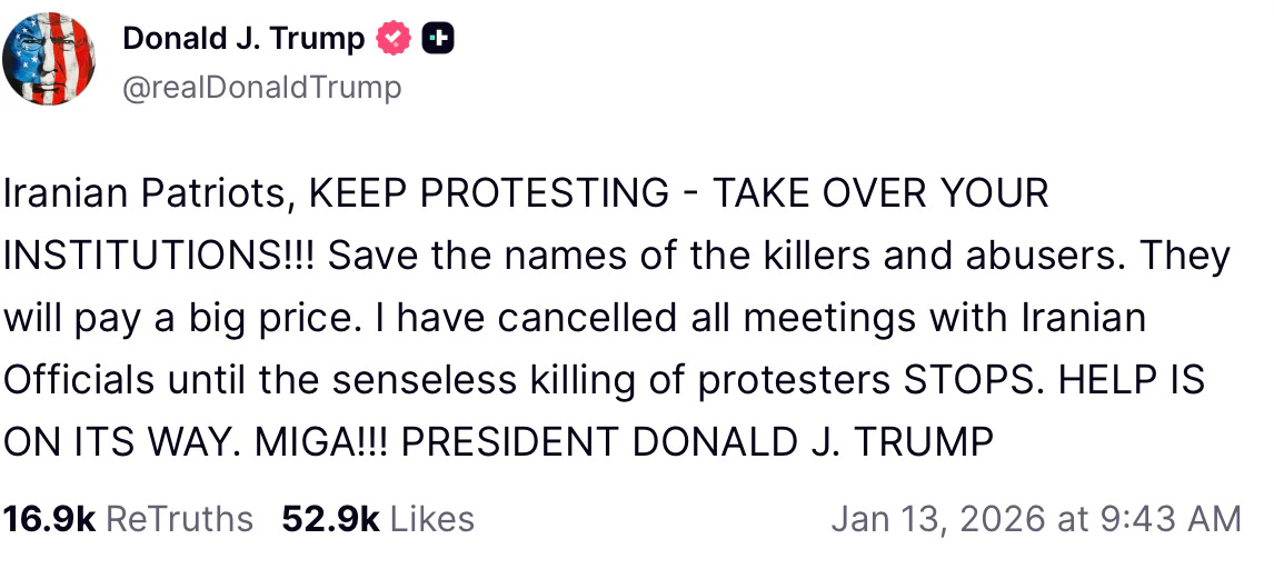 Trump has yet again signalled that a war with Iran is coming, encouraging rioters and protestors in the country to “keep protesting- take over your institutions” adding that “help is on its way”, suggesting an upcoming U.S./Israeli military intervention.