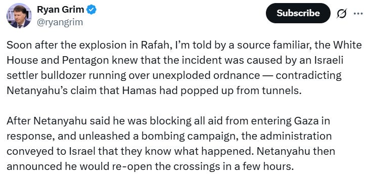 Soon after the explosion in Rafah, I’m told by a source familiar, the White House and Pentagon knew that the incident was caused by an Israeli settler bulldozer running over unexploded ordnance — contradicting Netanyahu’s claim that Hamas had popped up from tunnels.