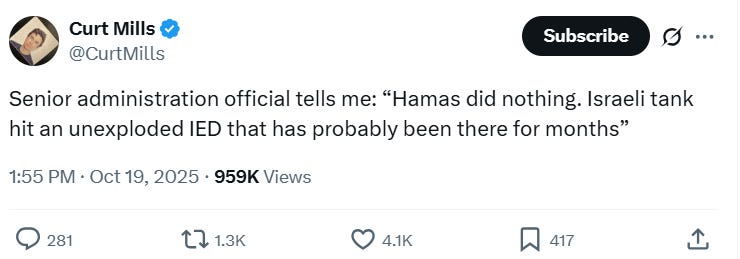 Curt Mills, the executive director of the American Conservative Magazine reported that a “Senior administration official tells me: ‘Hamas did nothing. Israeli tanks hit an unexploded IED that has probably been there for months’”.