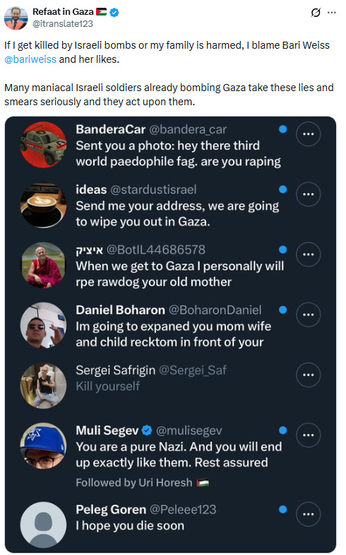 Following this smear, Bari Weiss’s followers in the IDF began sending graphic rape and murder threats towards Alareer and his family, saying things such as, “Send me your address, we are going to wipe you out in Gaza”, “When we get to Gaza I will personally rape rawdog your mother”, and “I’m going to expand your mom wife and child recktom in from of you”.