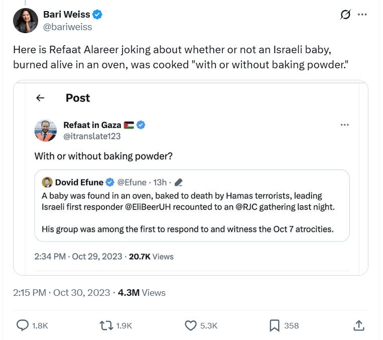 On October 30th of 2023, Weiss took a screen grab of the tweet and wrote, “Here is Refaat Alareer joking about whether or not an Israeli baby, burned alive in an oven, was cooked ‘with or without baking powder’”- without mentioning that the atrocity propaganda claim had been fully debunked- even by Israeli media.