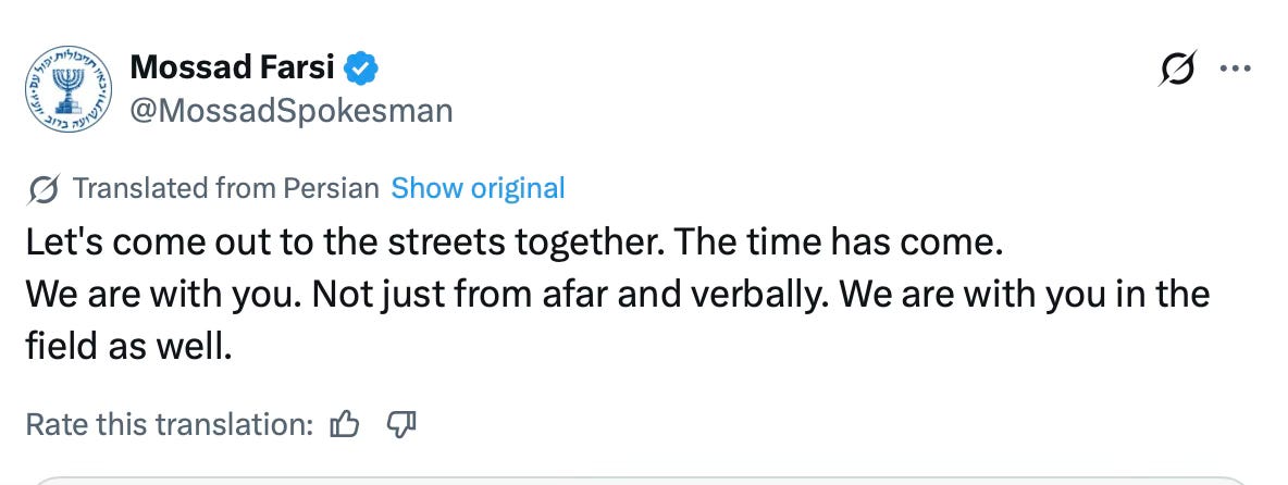 For context, on December 29th, an X account called “Mossad Farsi”- which the Israeli newspaper Ynet notes “is widely regarded as an official messaging channel of the Mossad targeting Iranian audiences, though Israel has not officially confirmed its ownership”-wrote, “Let’s come out to the streets together. The time has come.